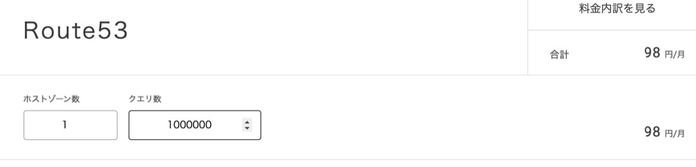 ↓ 98円 = 54円(月額固定でかかる1ホストゾーン代) + 45円(リクエスト回数(100万の場合)に応じた課金)